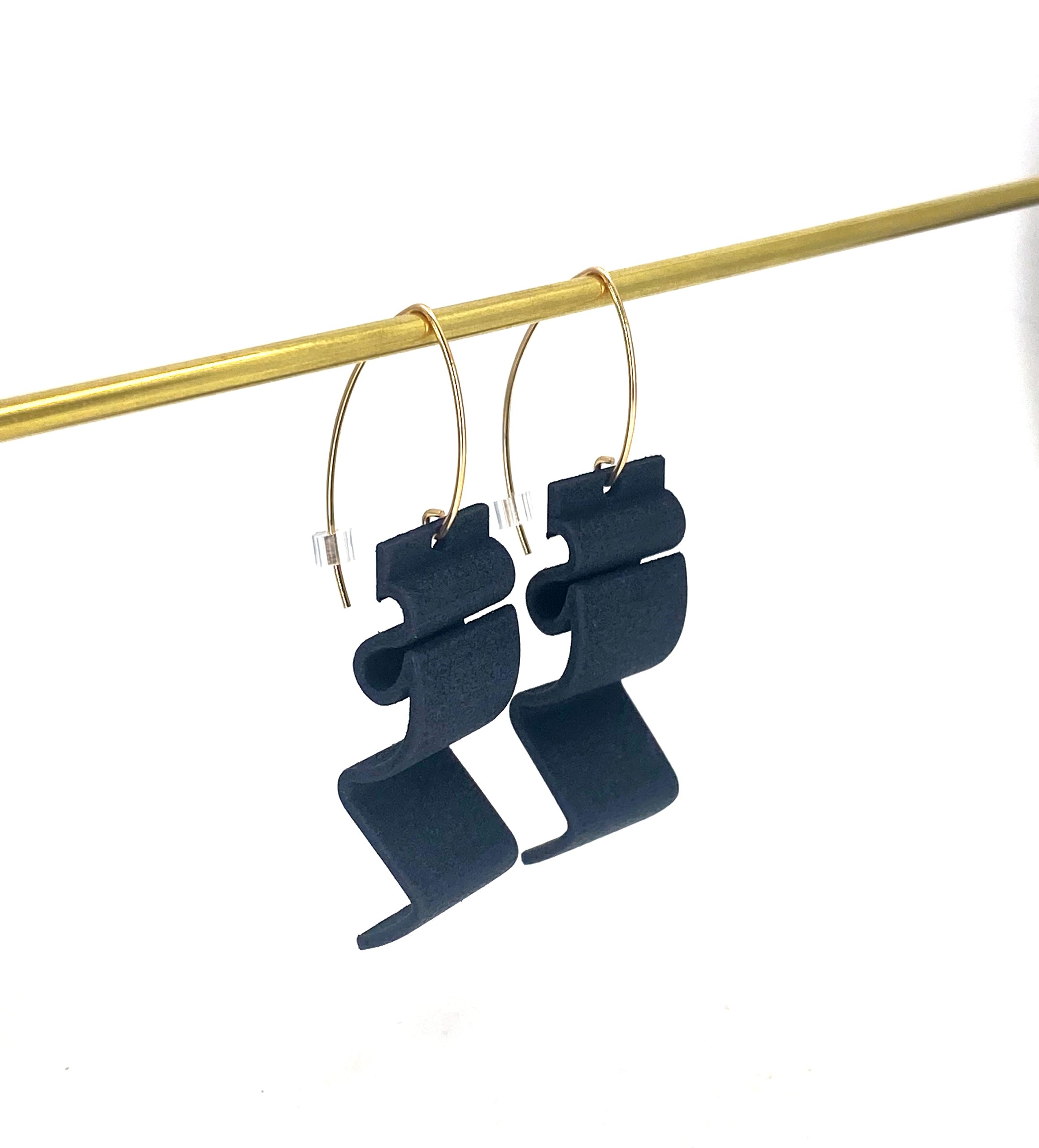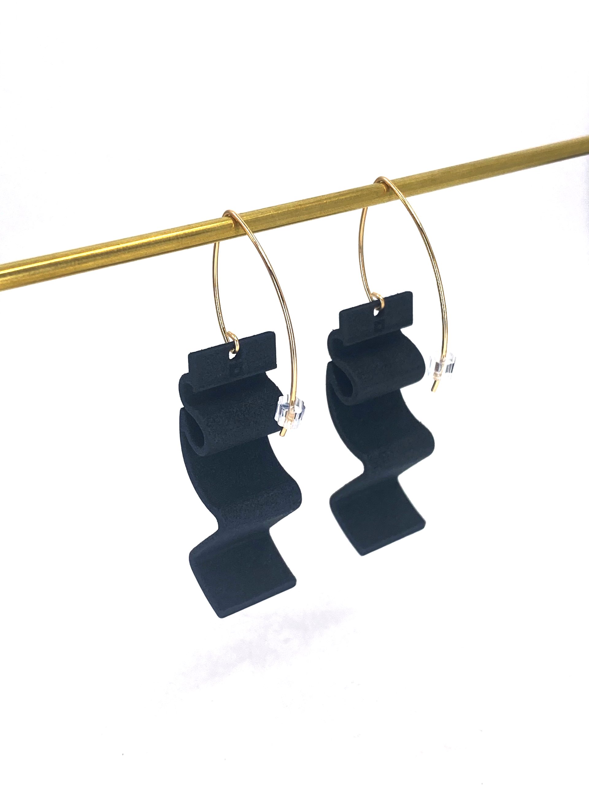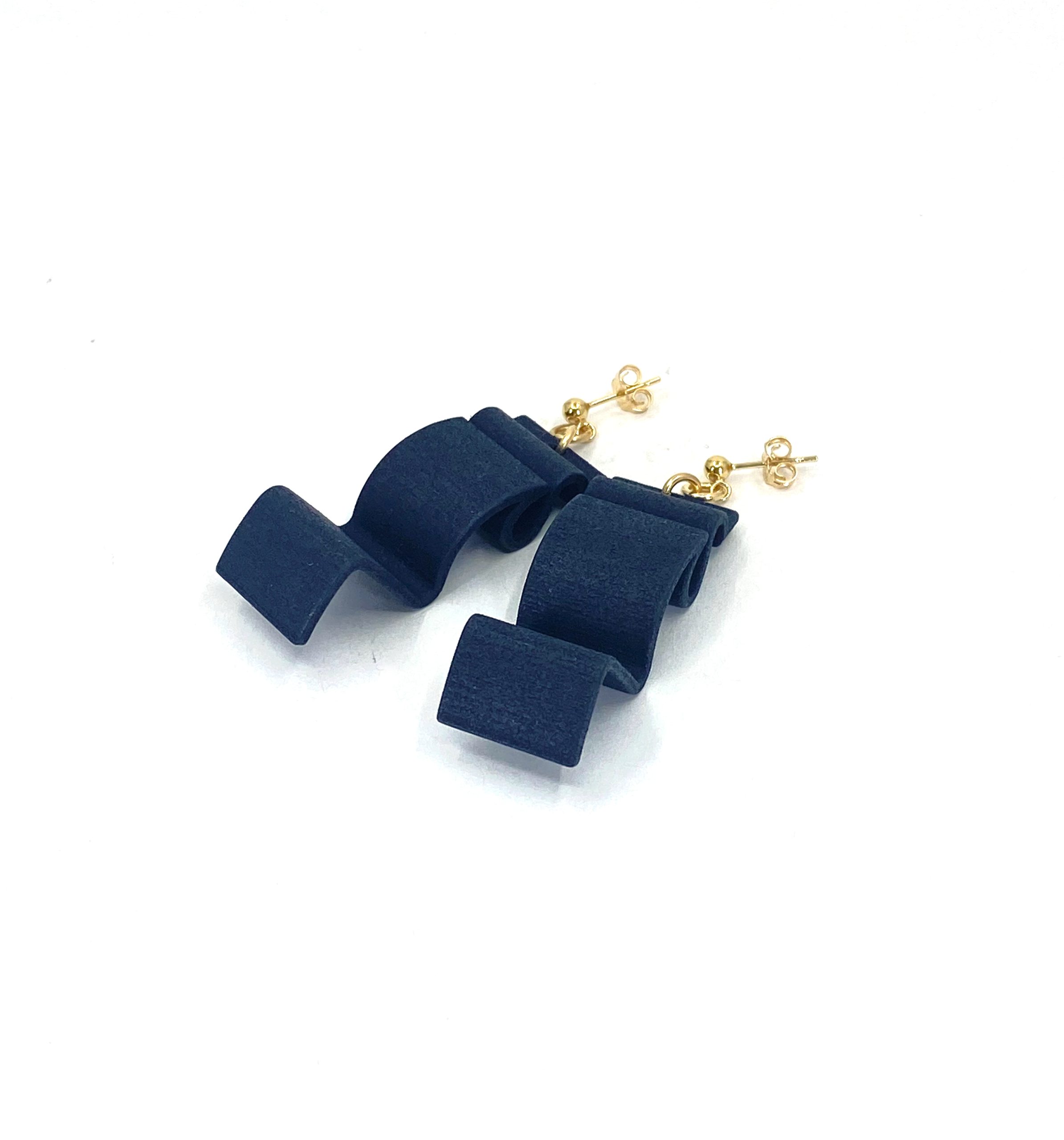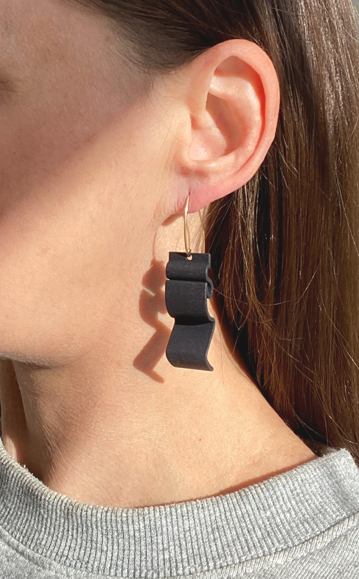 Modern earrings with an organic shape, inspired by formed metal architectural fascia – They are so striking in matt black & complimented with either a 14K Gold Filled threader ear hook with rubber stoppers or stud type with scroll back . The 3D print has an almost leather like texture and are slightly bendy but strong and very lightweight.