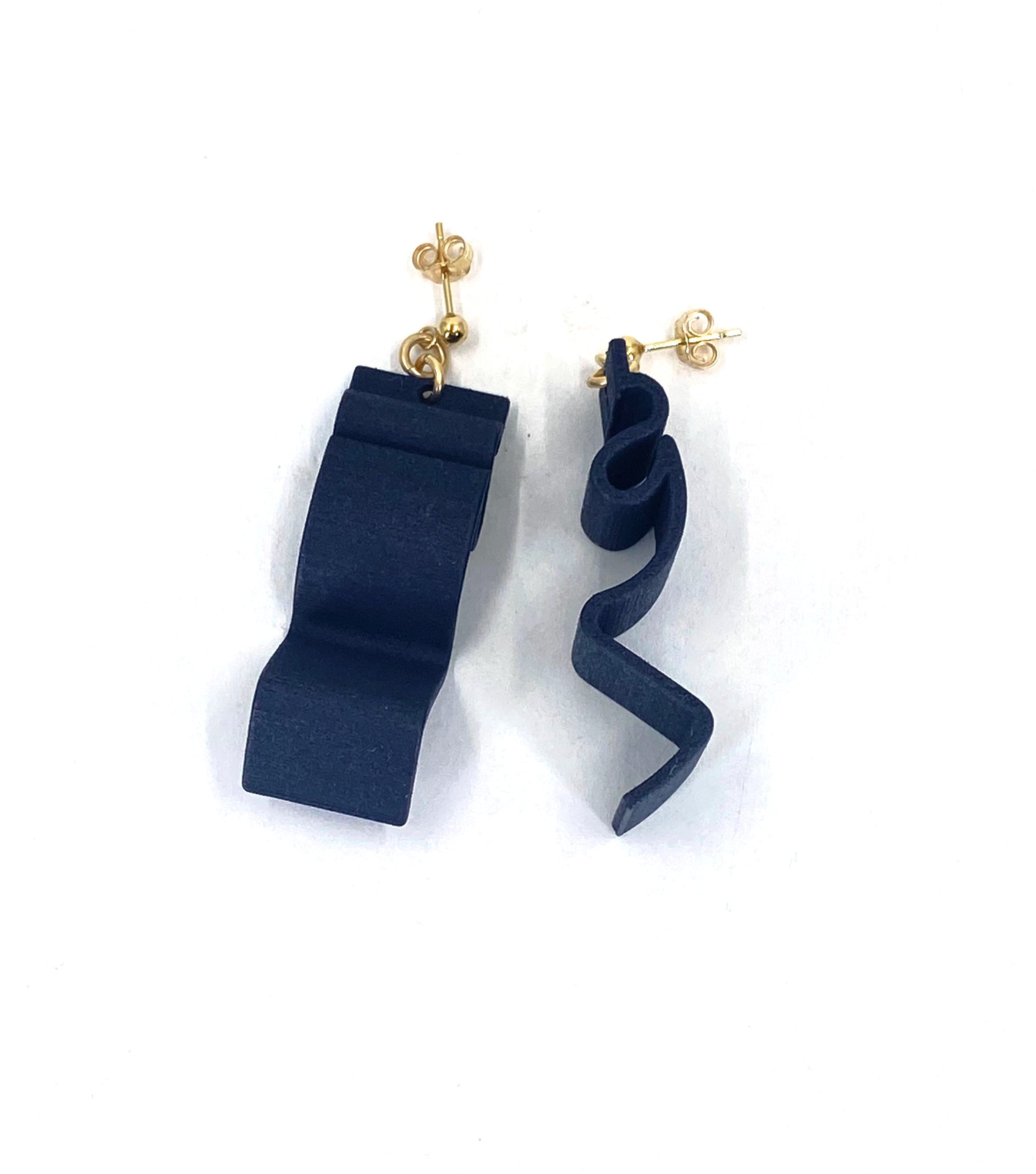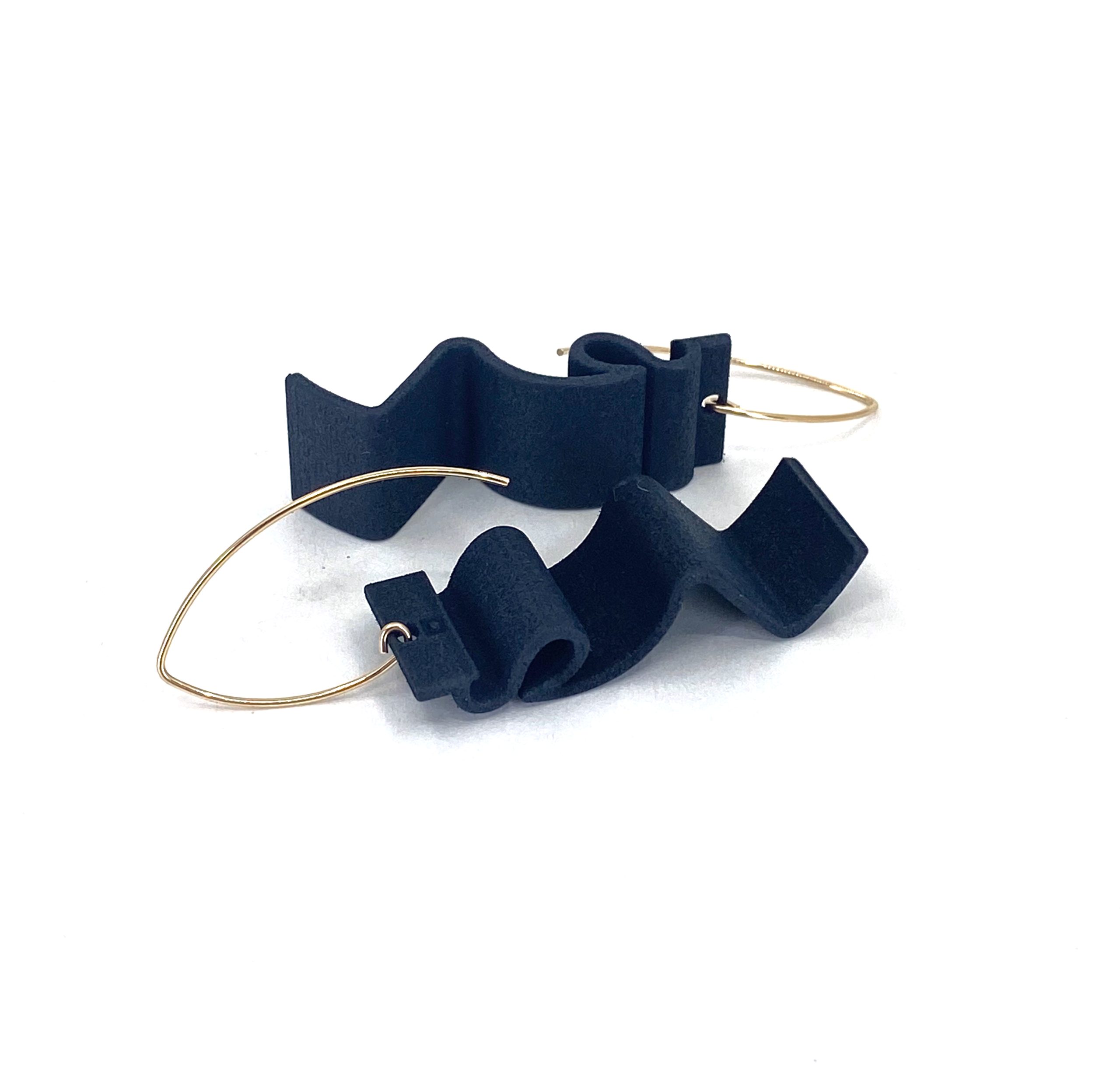 These earrings have been CAD designed in-house and 3D printed in a great durable, lightweight material called SLS Nylon. Its then coloured in a matt black with a skin safe dye. The ear threader wires and studs/backs are 14K Gold Filled metal.